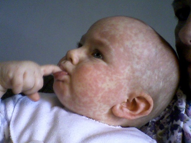 Min dreng på 6 måneder har haft rødt udslæt i 2-3 dage (tiltagende) og lettere feber, mellem 37-39 gr. Hans udslæt blusser op og falder ned igen flere gange i løbet af dagen, bådepå krop og i hovedet (der er dog konstant mørkerøde pletter rundt omkring på kroppen og på hovedet). Jeg var til lægen igår, som sagde at det var tre-dages feber! Men han har stadig pletter her til aften, så jeg er begyndt at tænke om det kan være noget andet. Min dreng har ikke fået penicillin eller anden medicin,så det kan ikke være det.