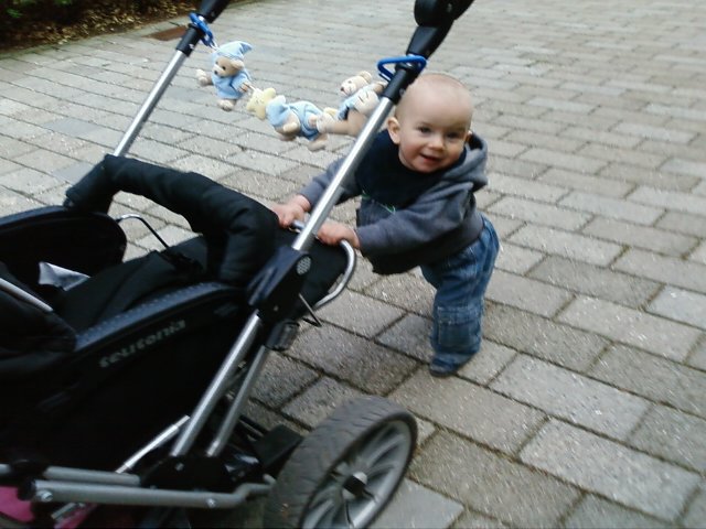 Nicholas Carl og jeg gik hjemad – og det sidste stykke gik han selv og skubbede klapvognen. Det syntes han var superskægt! Han gav af og til slip på klapvognen og gik et par skridt over til mig. Fantastisk – !!