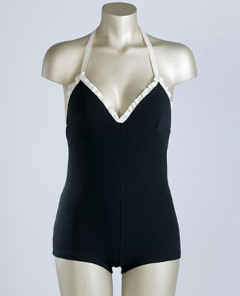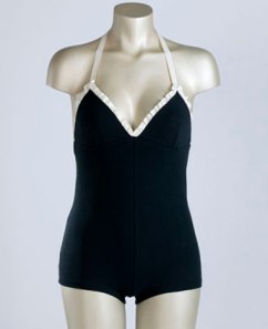 Så jeg må kapitulere og finde en badedragt, jeg kan holde ud at se på. Det vil sige ikke noget med fartstriber i siden, ikke noget Speedo, ingen blomster, flæser eller farvelade … bare sort, enkel og pæn. Noget a’la den her til højre, men jeg må nu nok indrømme, at jeg ikke har tænkt mig at betale 600 kroner for en badedragt. Det koster den her nemlig. Så meget vil jeg ikke ofre på en badedragt, der alligevel hurtigt bliver mølædt af at blive brugt i klorvand.