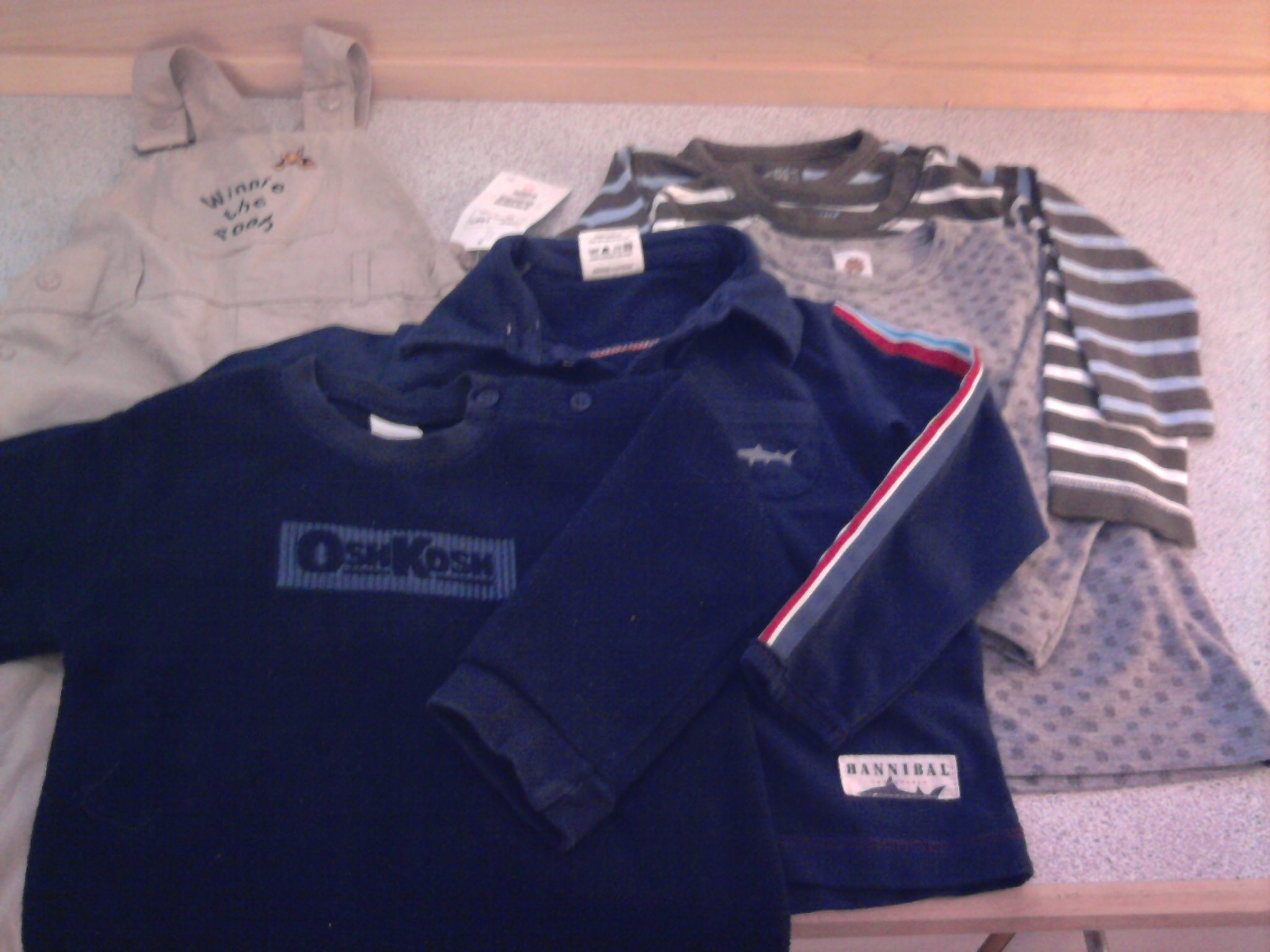 Dagens loppefund tæller 3 t-shirts fra L.O.G.G og Holly’s, et par overalls med Peter Plys (inkl. pris og gavebyttemærke) fra H&M og 2 lidt lune trøjer fra Hannibal og OshKosh. For alt i alt 100 kroner.
