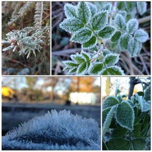Urene skulle stilles tilbage i nat, og vi vågnede atter op til en smuk morgen med masser af rimfrost på blomster, blade, grene og alt andet udendørs. Brrr … Det var koldt!