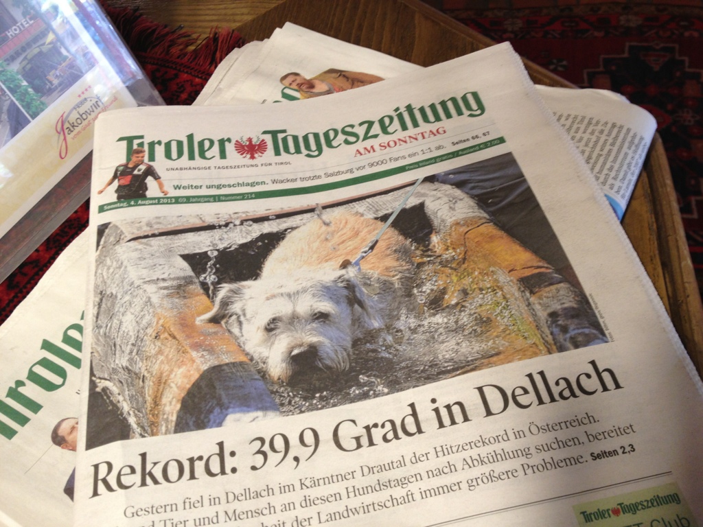 Denne forside stod vi op til. Dagen før var der blevet målt 39,9C i Tyrol – termometeret i vores bil rundede op til 40C. I skyggen.