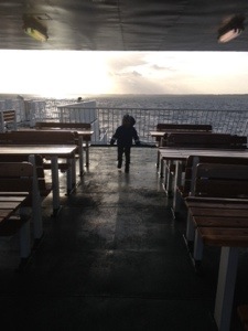20131104-100616.jpgSå afstiafsted til Hundested, hvor vi nåede en hurtig og lækker fiskebuffet på Røgeriet. Og så til søs med Rørvigfærgen. Vi stod udenfor oppe på soldækket i pivstiv kuling. Nicholas løb rundt; lod sig blæse afsted for så at løbe op mod vinden. Han jublede, og hans perlende latter blev båret væk af vinden.