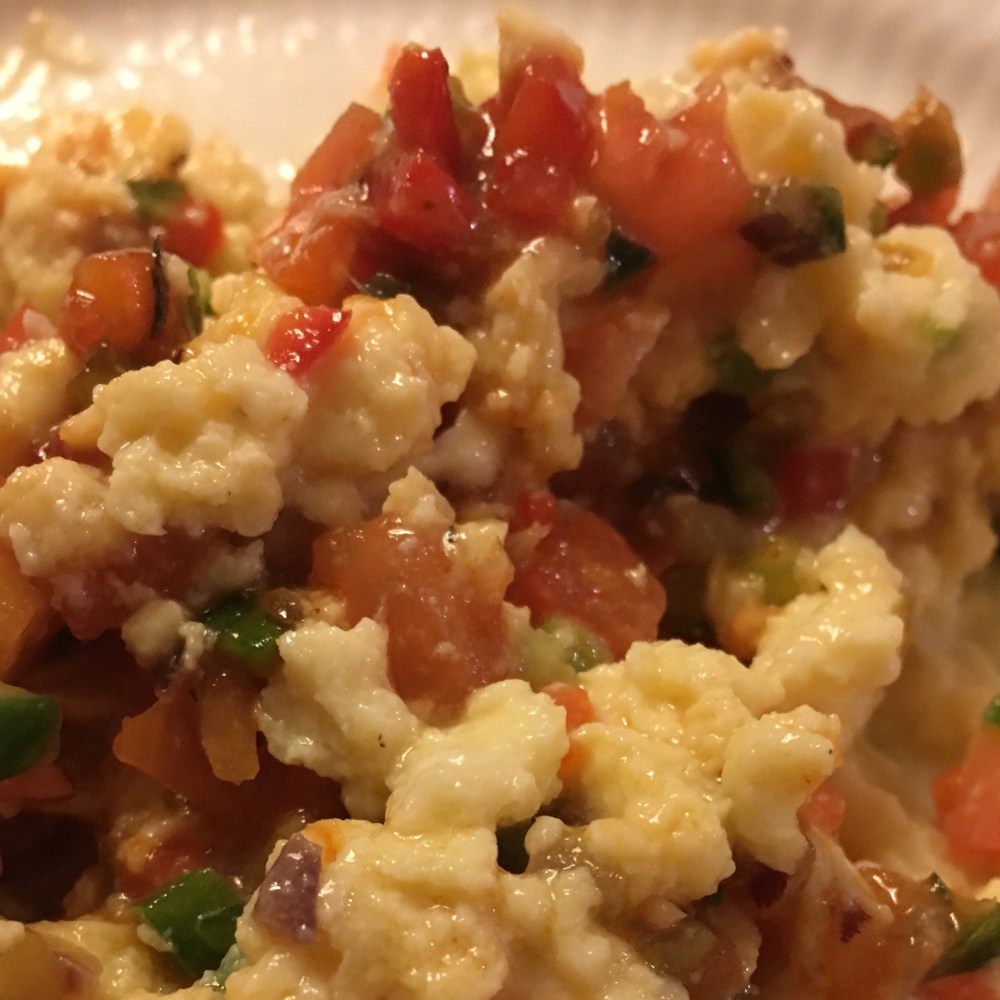 Min søde mand lavede røræg a’la Spreegold til aften – dvs røræg med tomat, løg, agurk, peberfrugt i småbitte stykker, samt mozzarella og creme fraïche. Mums 👌🏼
