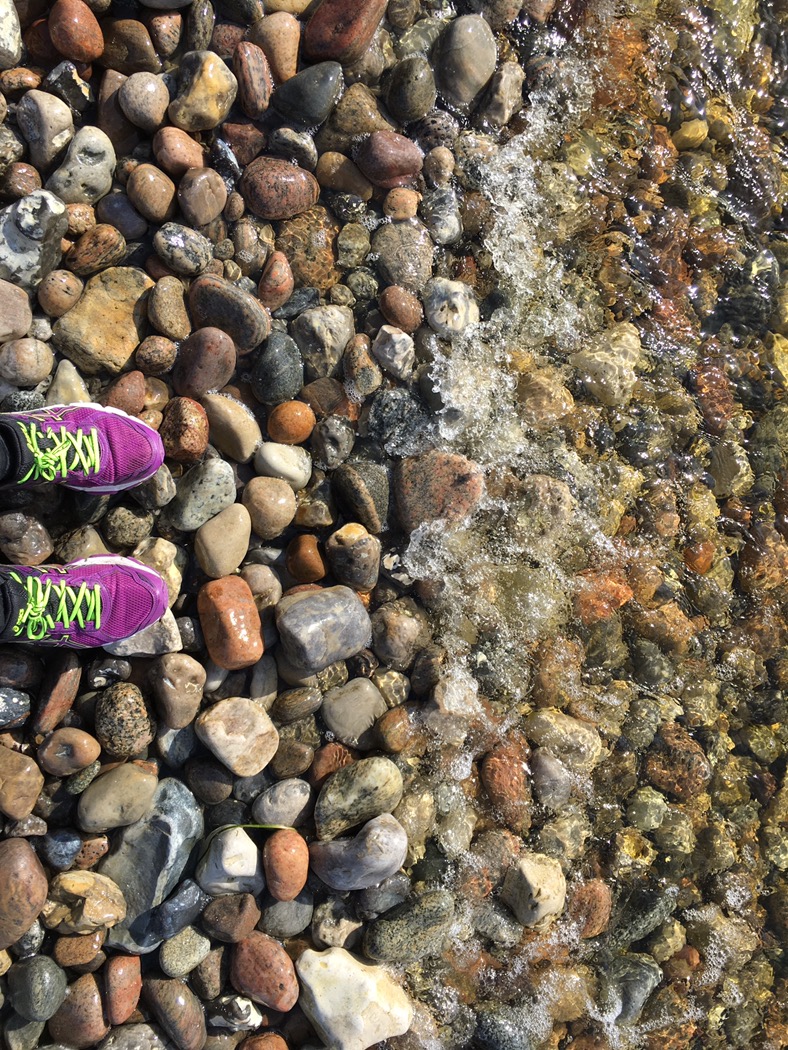 Der var også tid til at stå med skosnuderne i vandkanten. Vi kastede med sten og grinede i det fine vejr.
