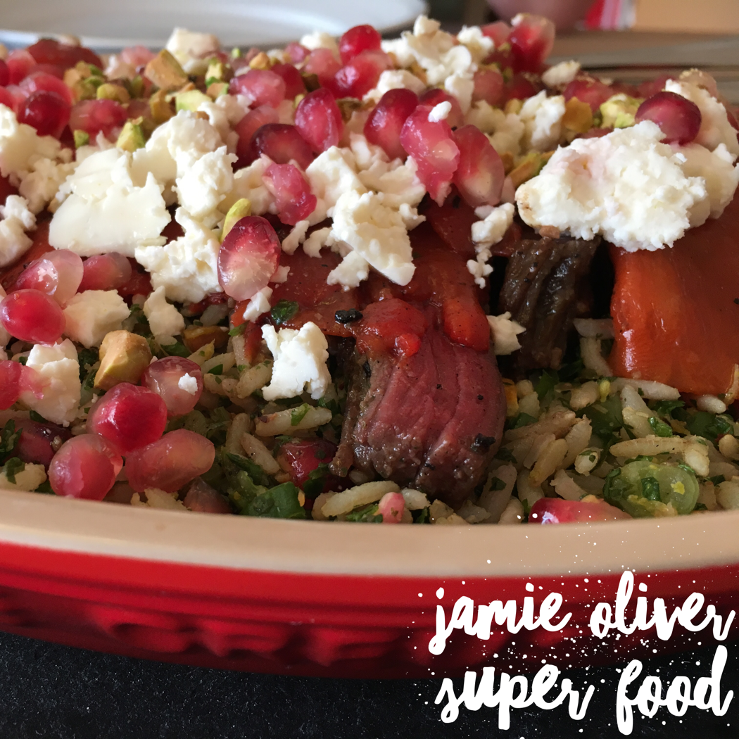Det er her, at min mands fødselsdagsgave ramte mig spot on; Jamie Olivers bog ‘Superfood’. Jeg er så glad for den. Jeg kan nemlig godt li’tanken om at lave og spise mad, der virker som forkælelse på flere planer.