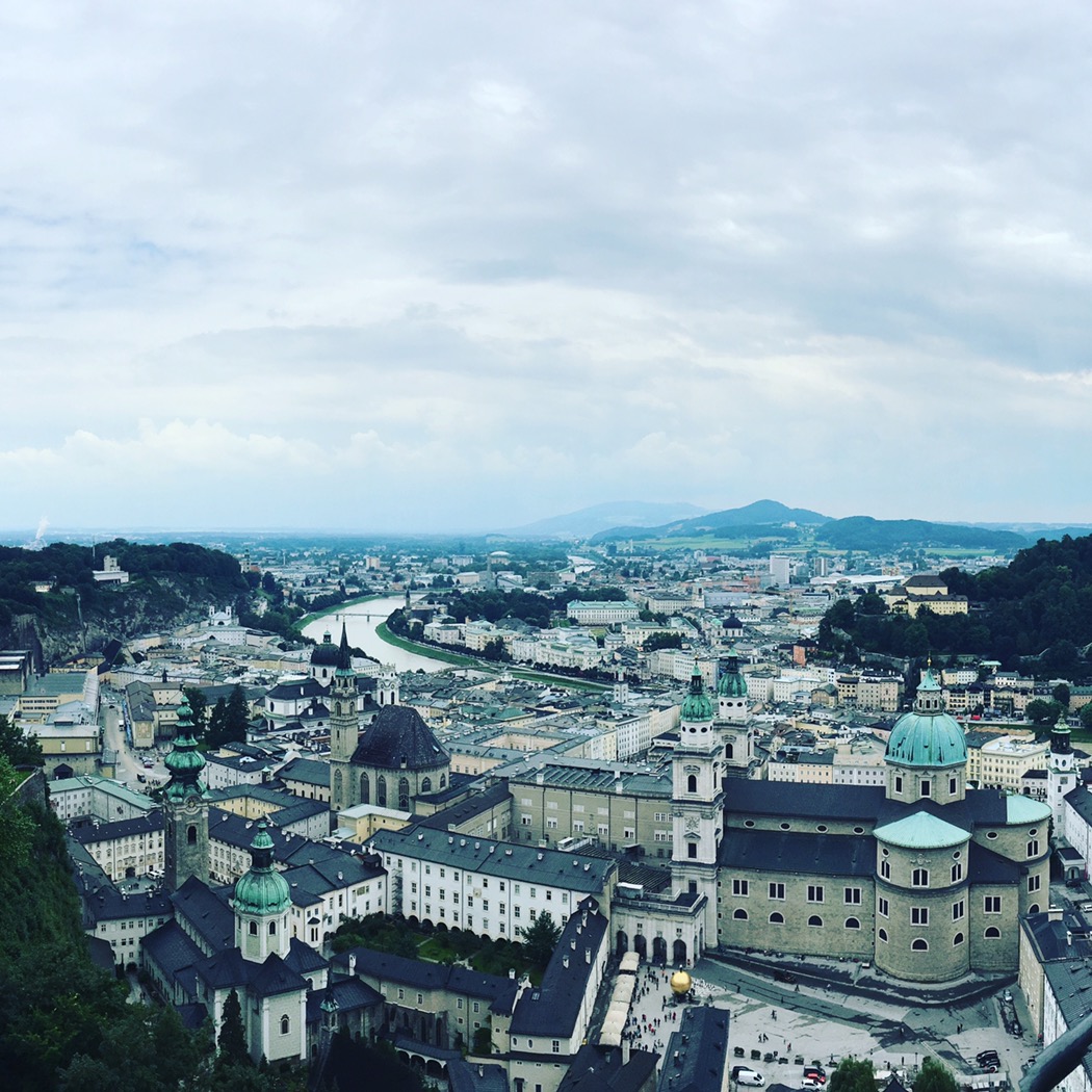 Efter at have spejdet i vejrudsigterne efter tørvejr, så valgte vi at køre til Salzburg, for vejrudsigten der var lidt bedre. Det tager 1 1/2 time i bil fra Westendorf, og så har vi et par timer dér og kan nå hjem til aftensmaden på hotellet. Planen var at besøge endnu en borg; nemlig Hohensalzburg, som ligger højt over Salzburg.