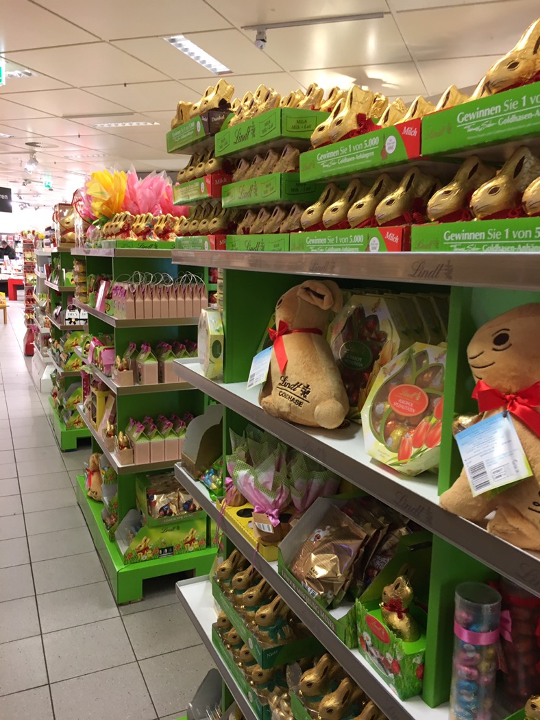 På billedet kan du se en af mange påskeudstillinger i Karstadt med påskeharer. Prøv lige at se hvor gigantisk Lindt chokoladeharen, der titter frem bag det gule og pink silkepapir er. Den vejer 1 kg. Altså 1 kg chokoladehare … det er en ordentlig kleppert, når man tænker på, at den er hul indeni. Men så er den altså også håndindpakket i guldstaniol og pakket i en fin eksklusiv Trägetasche.