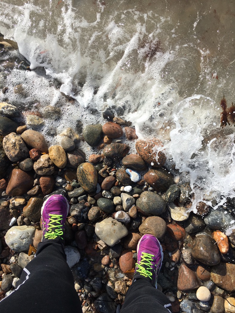Løbeture på stranden i rullestenene er godt for anklerne. Det går langsomt, og ja, jeg fik en våd sok 🙂
