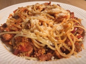 Pres hvidløg og tilsæt sammen med hakket chili. Hæld vin og passata i (jeg synes, at lidt over halvdelen af passata’en var nok).Vend den drænede spaghetti sammen med saucen og riv parmesan over og drys evt basilikum over.