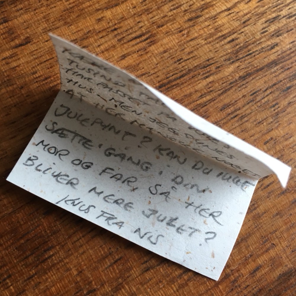 “Nissen har været der” råbte drengen begejstret. Han vågnede tidligere end ellers – og ja, nissen er flyttet ind igen bag den lille hvide dør i stuen. Hans små træsko stod udenfor på trappen. Han havde lagt en lille chokoladekugle og et lillebitte brev til drengen.