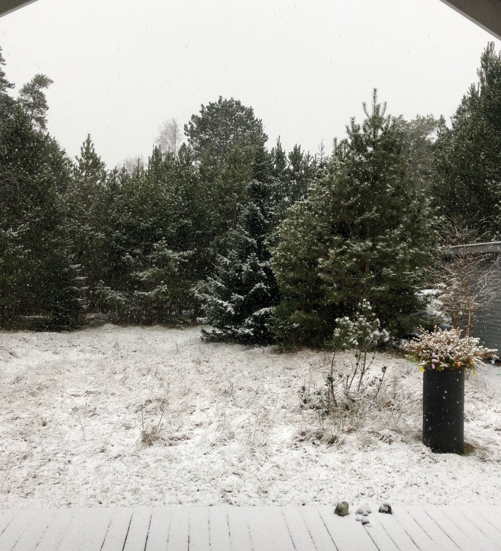 Vi kunne ikke lade være med at grine, da vi stod op til denne udsigt. Det er smukt, men også fuldstændig skørt! Det er jo den 1. April, og det har været forår i en hel måned nu … ifølge kalenderen. Men naturen vil noget andet – og her til morgen var det smukt hvidt udenfor det lille grå sommerhus. Der var ikke andet for end at sende manden til bageren, tænde op i kakkelovnen og lave en kande kaffe 🙂