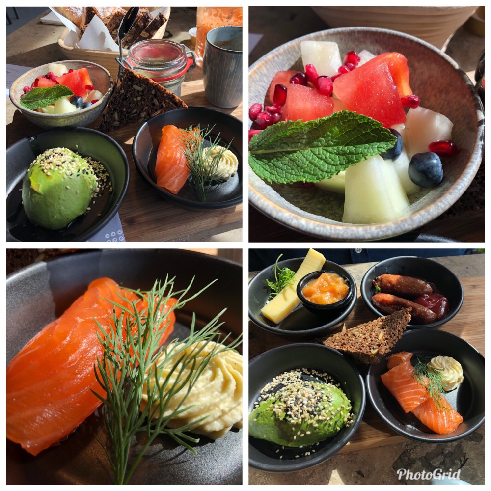 Chiagrød med kiwikompot, koldrøget silkeblød laks, silkeblød avocado med sesam på ristet rugbrød, lækker frugtsalat af to slags lækker saftig moden melon med granatæble. Plus lækkert brød og en mandelcroissant. Vi købte masser af kaffe; jeg startede med en stor cortado, men havde stadig morgenøjne, så jeg bestilte også en stor latte at vågne helt på.