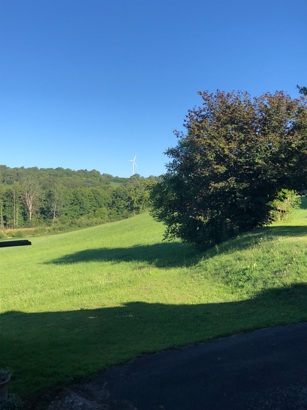 Jeg satte vækkeuret til klokken 7, og vi vågnede klokken 8. Morgenluften strømmede krystalklar, kølig, frisk og duftende ind af den åbne dør bare en meter fra min hovedpude. Vi slog øjnene op med et smil. Jeg gik ud af havedøren til den lille trappe og blev mødt af denne skønne udsigt til en grøn eng og blå himmel.
