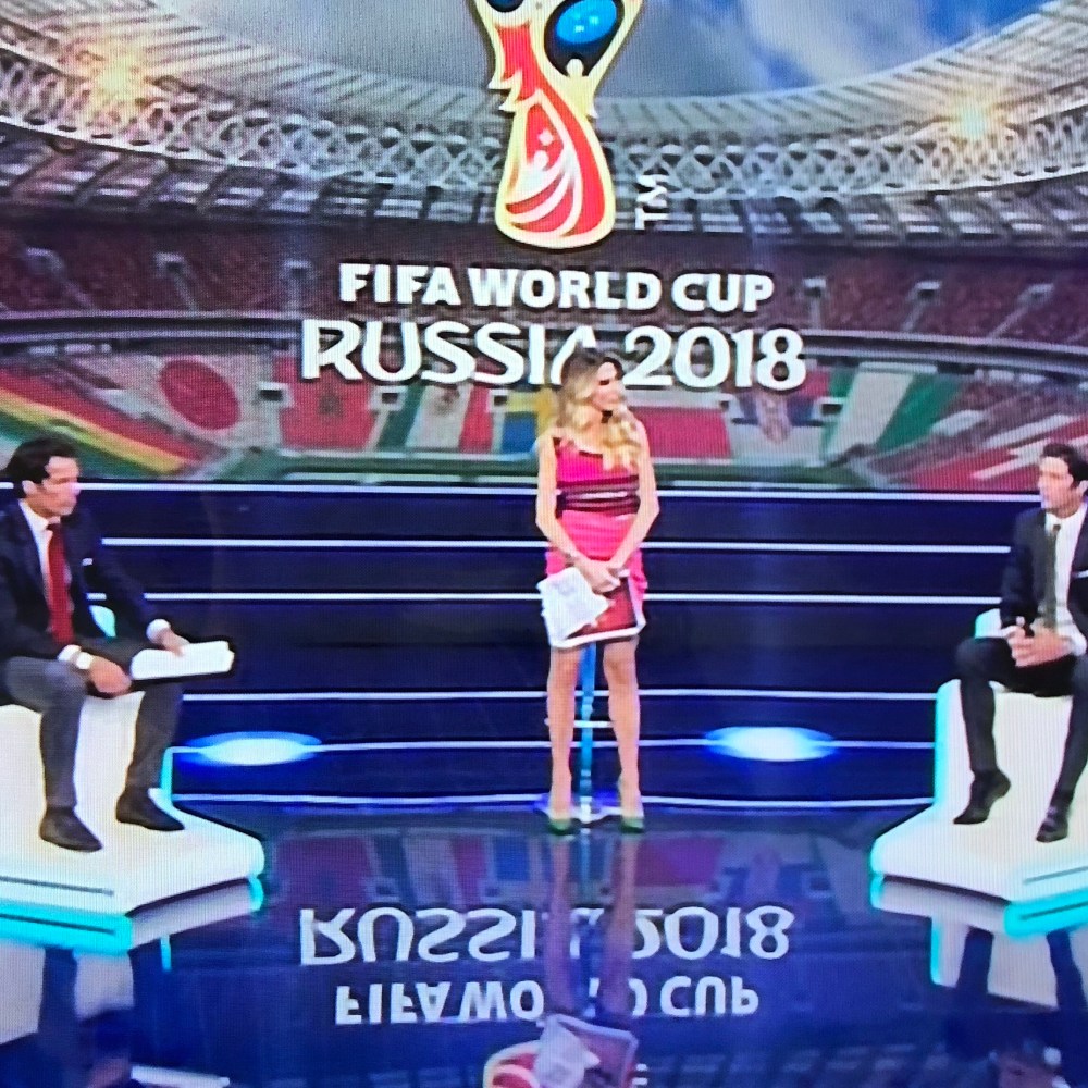 Hvem andre finder på i 2018 at sætte en blond kvindelig studievært op på en lyseblå papegøjepind, i en meget lille kjole? De to (mandlige) fodboldeksperter har fået en stol hver. Og et jakkesæt.