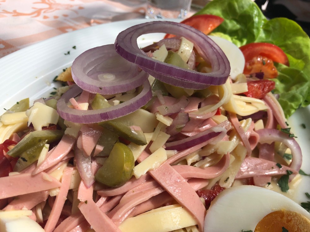 Vi bestilte selvfølgelig the one and only Wurstsalat!