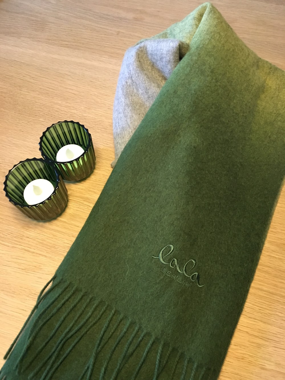Jeg fik det smukkeste grønne dip dye tørklæde i grøn-gråt af min mand. Det er så blødt og lækkert – og hvis der skulle komme kulde er jeg klar. Her hos mig er alt under 20 C = kulde.