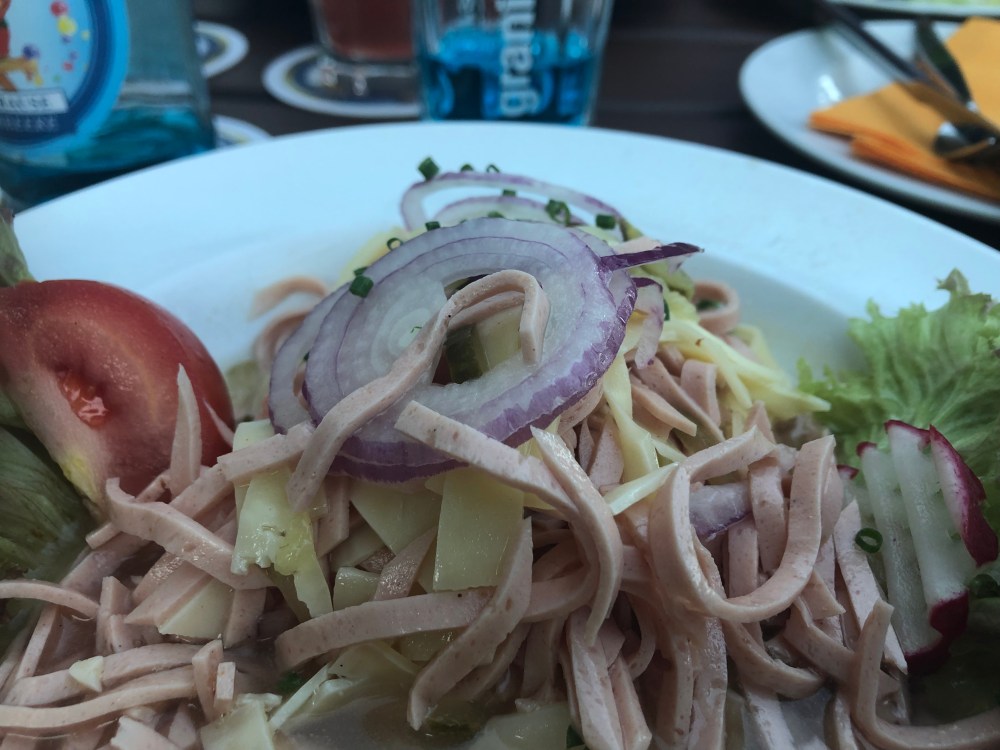 Jeg valgte en schweizisk wurstsalat. Det er en af mine favoritter; syrlig dressing, løg, purløg, sure agurker, strimler af god emmenthaler og Lyoner-pølse i en dyb tallerken. Mums!