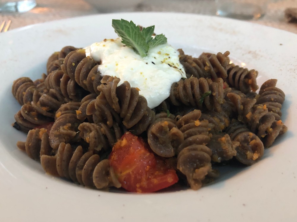 Jeg valgte fusillo al grano arso con erbe selvatiche di stagione, pomodorino e crema di straciatella.