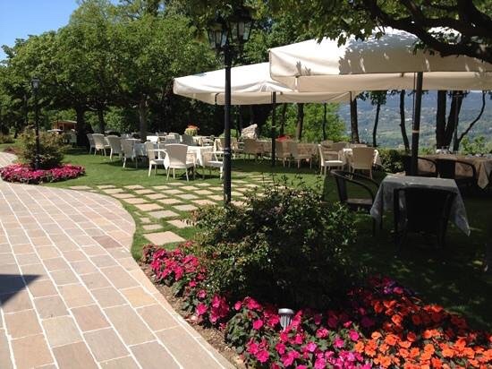Der er noget helt særligt ved at sidde under store hvide parasoller i en grøn frodig have med udsigt til en bjerglandsby og Monte Baldo. Rundt om i haven står veldækkede borde med flødefarvede tykke duge og byder velkommen.