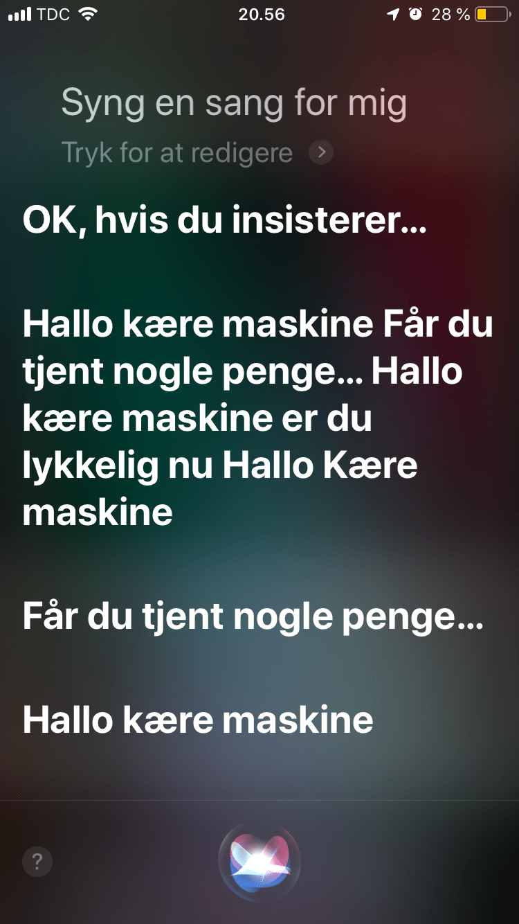 - Siri; jeg elsker Siri. Hun fortæller mig, hvad jeg skal i dagens løb, når jeg spørger. Hun skriver sms’er og ringer op, når jeg taler pænt til hende. Har du spurgt din Siri om hun kan beatboxe? Hvis beatbox ikke er din stil, så synger Siri også en sang, hvis du beder pænt: