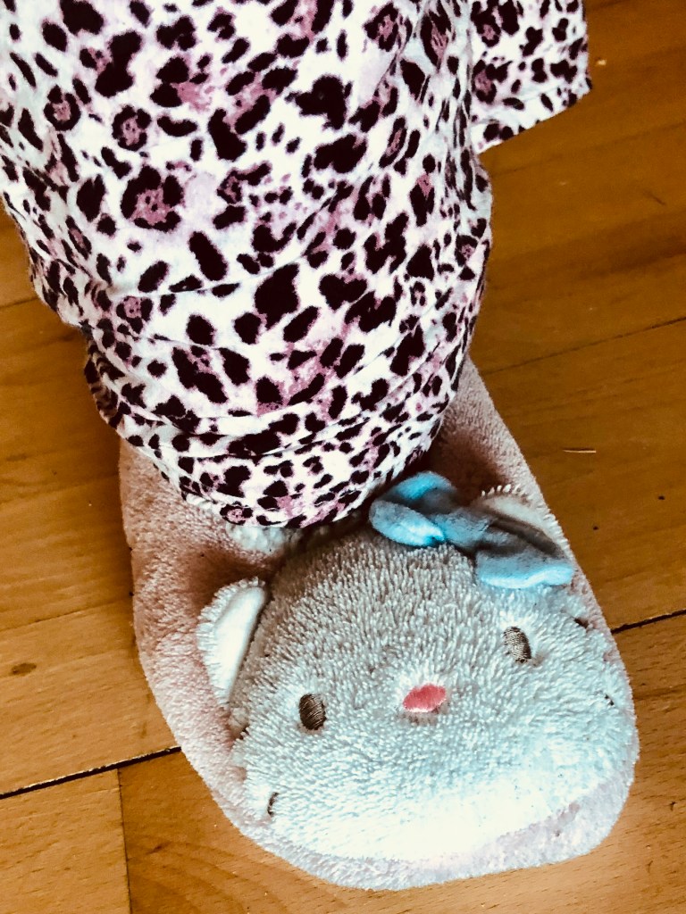 Så sidder jeg dér og holder møder i øjenhøjde herhjemme – med hår med fine grå udvoksninger, make-up og øreringe iført en kontoragtig bluse – samt lyserøde leopardhyggebukser og Hello Kitty plyshjemmesko under bordet.