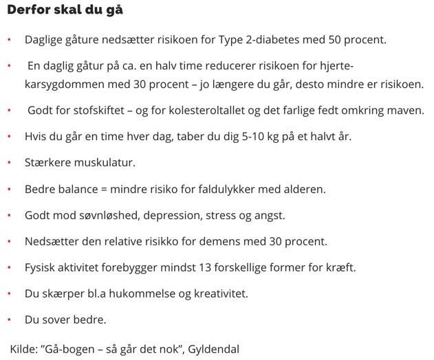 Det er de fordele ved at gå ture, som jeg oplever. Der er skrevet bøger om fordelene ved at gå, for der er mange fordele. Flere af de store forfattere og digtere gik den samme rute hver dag og hentede inspiration på den måde. Her er lidt flere fordele fra Bente Klarlund:
