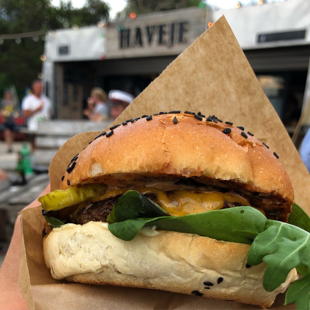Vi tog til Gudmindrup Strand og spiste en Haveje-burger. Mmmm… Jeg fik Special-burgeren med bl.a. chili mayo og røget chili; det er min favorit. Det er ikke just en genert burger 😋