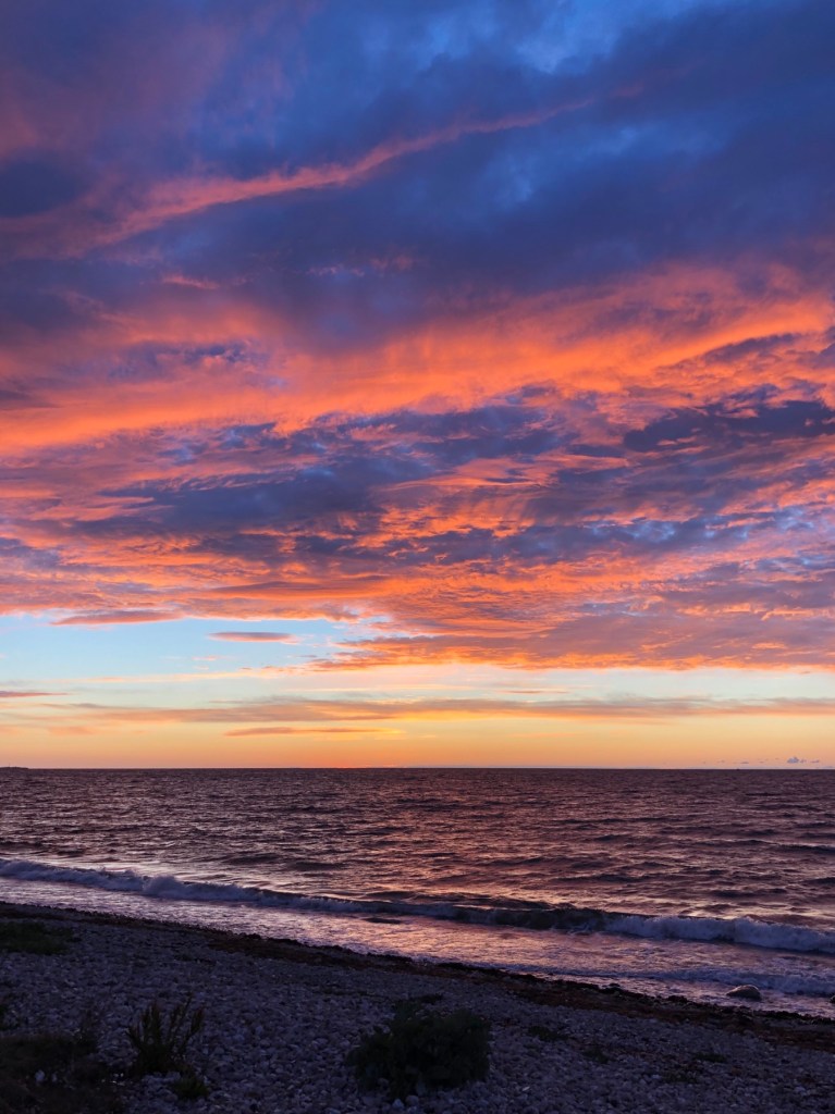 Knægten hoppede på trampolin i den smukke aften. Og pludselig spottede jeg den smukkeste solnedgang over træerne. Ind i bilen og afsted de 800 meter ned til Kattegatkysten, hvor solen går ned. Vi nåede ikke at se solen gå ned, men se lige hvor smukt det var efter solnedgang🤩