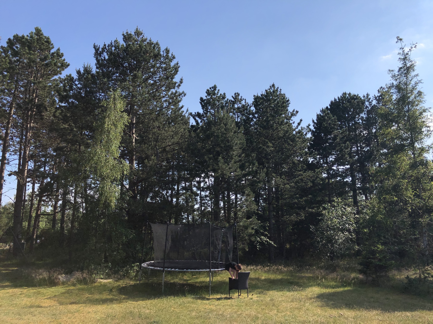 Det var supervarmt, da vi ankom, så vi skyndte os at pakke bilen ud og stille vores ting strategiske steder uden at pakke ud. Knægten løb rundt om huset om til trampolinen.