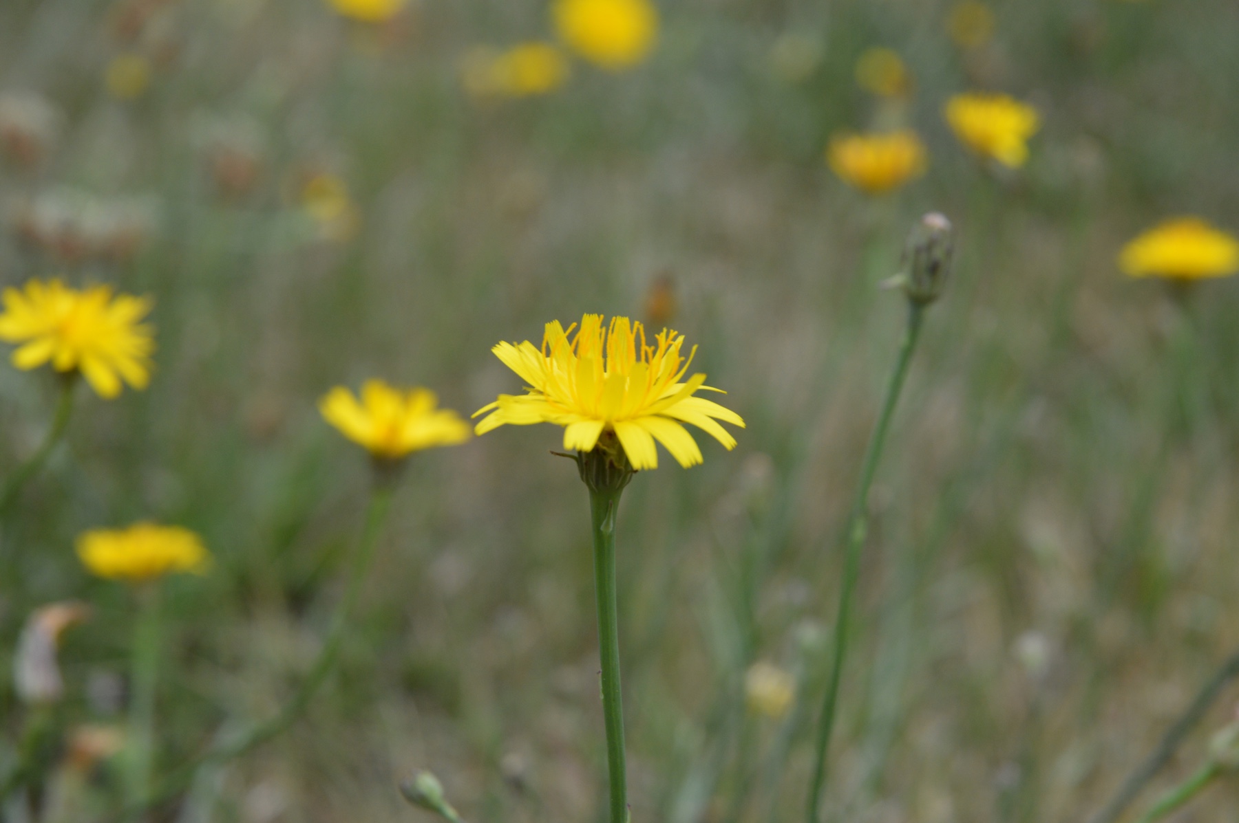 I mellemtiden opdagede vi, at tusindvis af mælkebøttelignende blomster (mon vi er ude i en tidlig høstbost?) var sprunget ud i det høje græs på græsplænen. Aftenen forinden var der ingen blomster i det høje græs på plænen, men nu var der tusindvis knæhøje gule blomster, der frejdigt lyste plænen op.