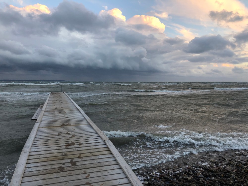 Vi gik en tur langs stranden, og jeg tror aldrig, jeg har grinet så meget. Det var stormvejr, men vi havde slet ikke forventet, at det var SÅ vildt!! Vi kunne læne os op af vinden, og jeg var ved at blæse i vandet fra badebroen. Til trods for, at det er min 34. sommer i Danmark, så har jeg aldrig oplevet en sommerstorm på denne måde.