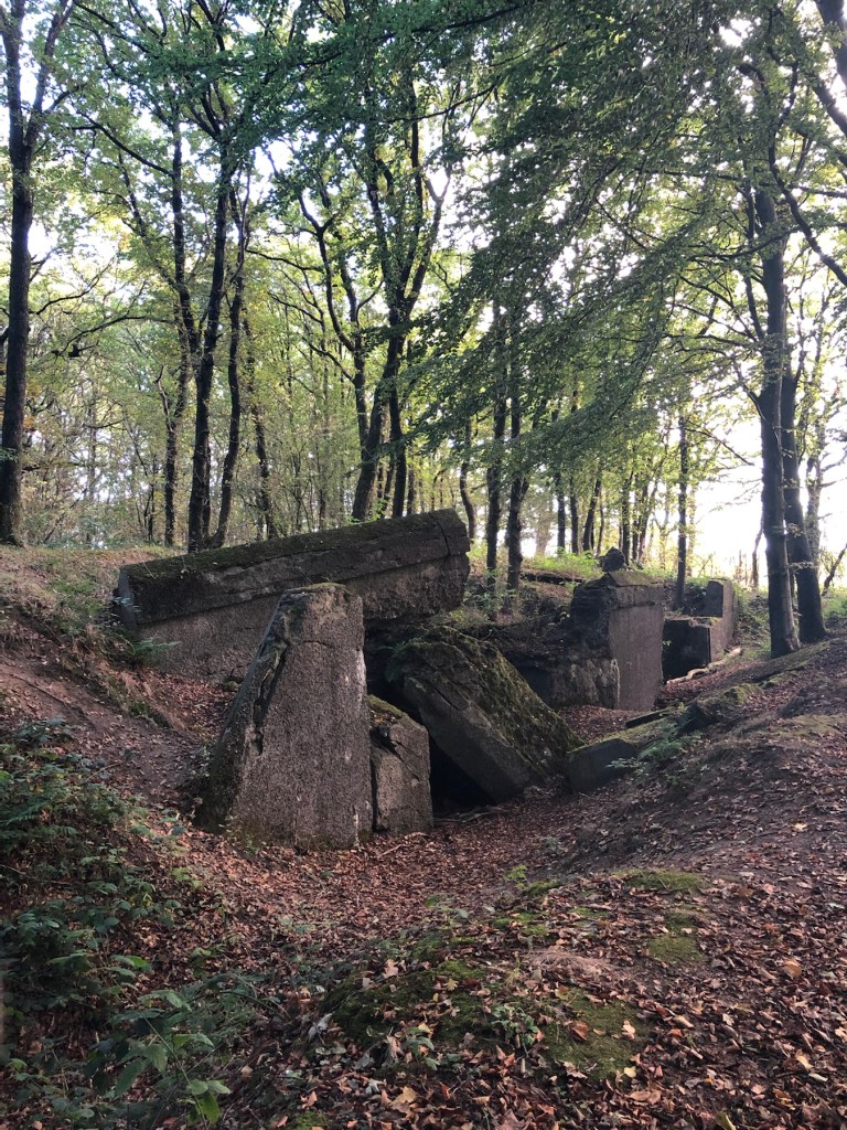 Vi kørte til den nærliggende p-plads. Bunkeren ligger 500 meter fra p-pladsen igennem en flot og vild skov. Først løvskov og siden helt tæt og mørk nåleskov. Der midt i skoven lå resterne af bunkerens betonvægge hulter til bulter. Vi gik en runde i den ene ende, og det var et imponerende syn. 100 år gammelt ..