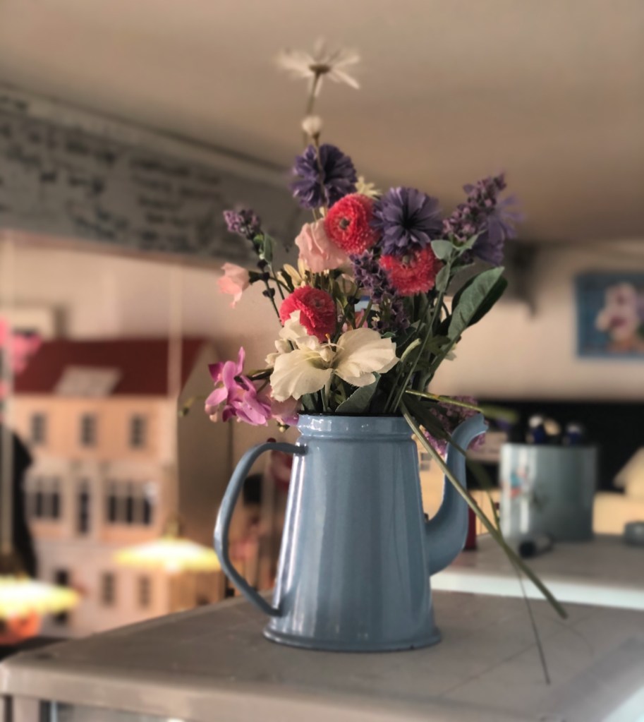 Som nævnt kan man købe nærmest alt indenfor, og det benyttede jeg mig af: Jeg købte to gamle flødeflasker med hjem; 1/5 liter og 1/10 liter i klar glas. De er så fine enten til mælk i kaffen eller til blomster – eller bare til pynt. De klare mælkeflasker udgik i 1959, hvor de blev erstattet af de brune mælkeflasker. I 1971 – blot 1 år før jeg blev født – blev mælkeflaskerne erstattet af mælkekartoner.