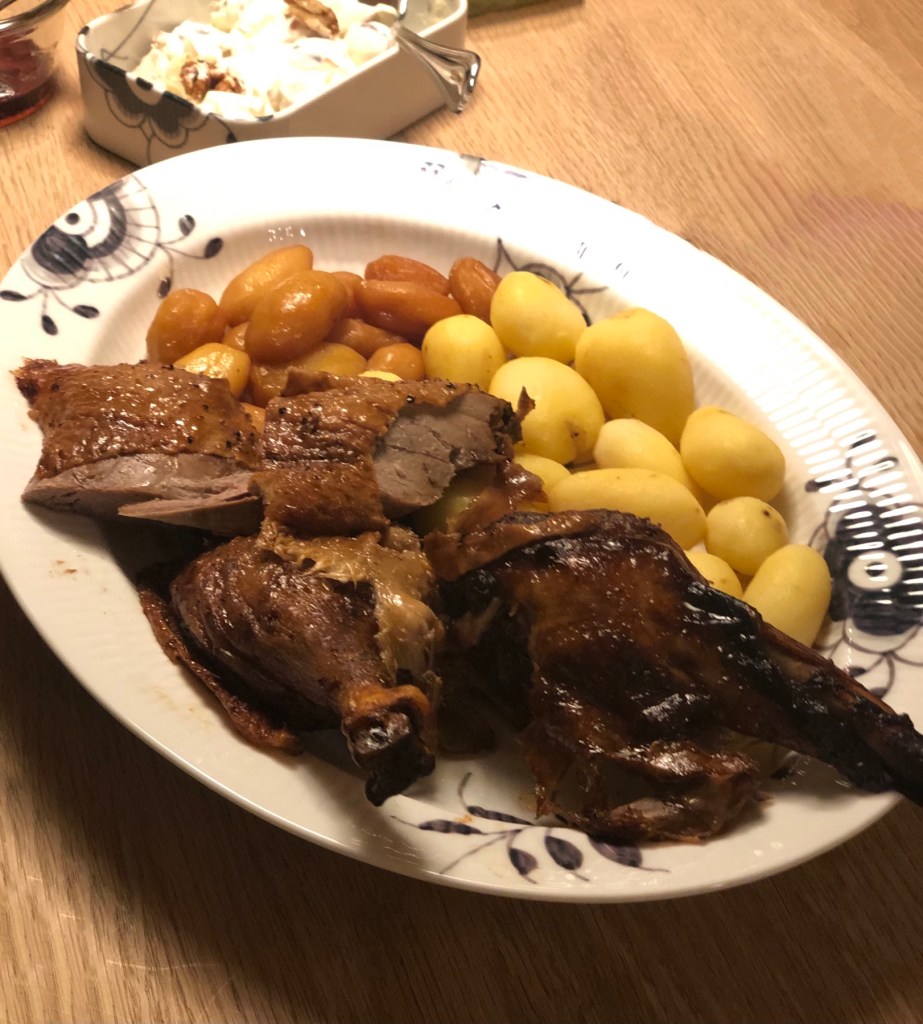 Dagens måltid bestod ikke overraskende af and, hvide og brune kartofler, rødkål, waldorfsalat, æbler, svesker, andesauce og æblekage – alt sammen fra den lokale slagter. Jeg kan ikke li’ and, men jeg prøver troligt 2 gange hvert år – det kunne jo være, at mine smagsløg ændrer mening med tiden. Denne gang var det tæt på: Det smagte næsten godt! Saucen var fantastisk!