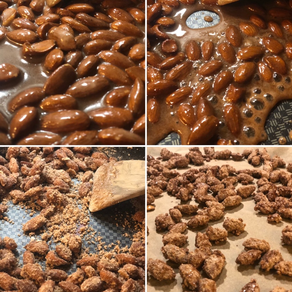 Når vandet er fordampet, begynder sukkeret at klumpe og se tørt ud. Så tænker man, at det er mislykket, men hold ud! Snart dufter der brunt og brændt, og så begynder sukkeret at fæstne sig på mandlerne.
