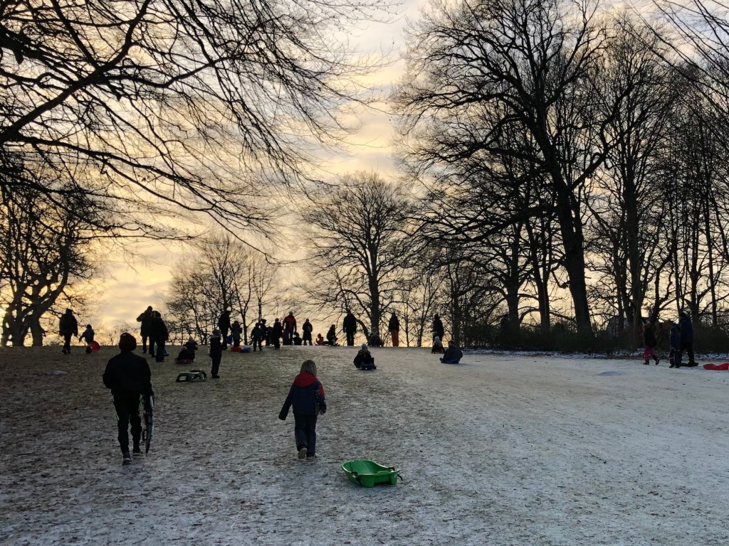I løbet af ugen smelter sneen, og derfor skyndte vi os at grave kælkene frem fra kælderens dyb og kastede dem i bilen og satte kurs mod den nordvendte kælkebakke i Sorgenfri Slotspark. Der var fest og glade dage – og to meters afstand.
