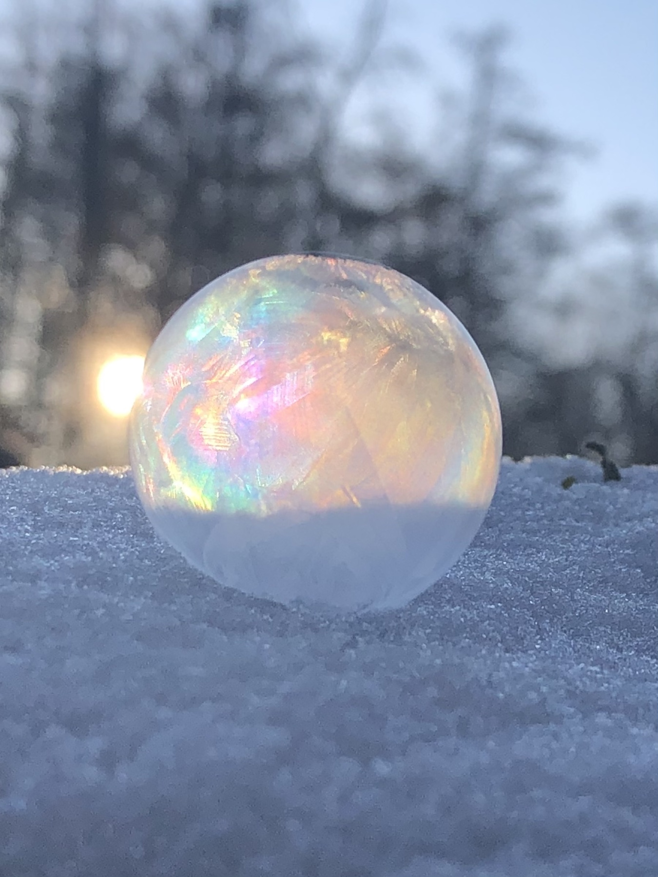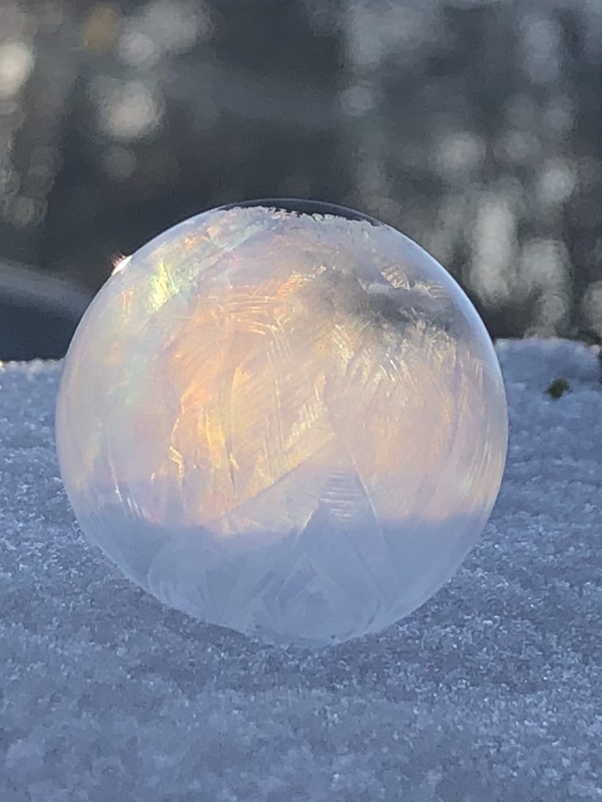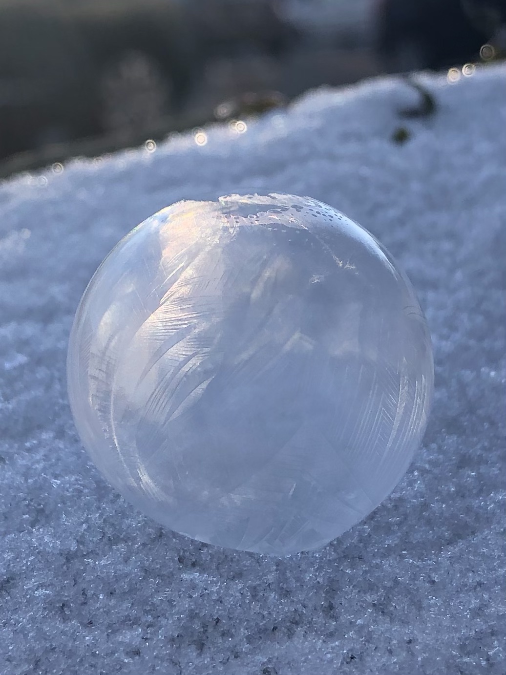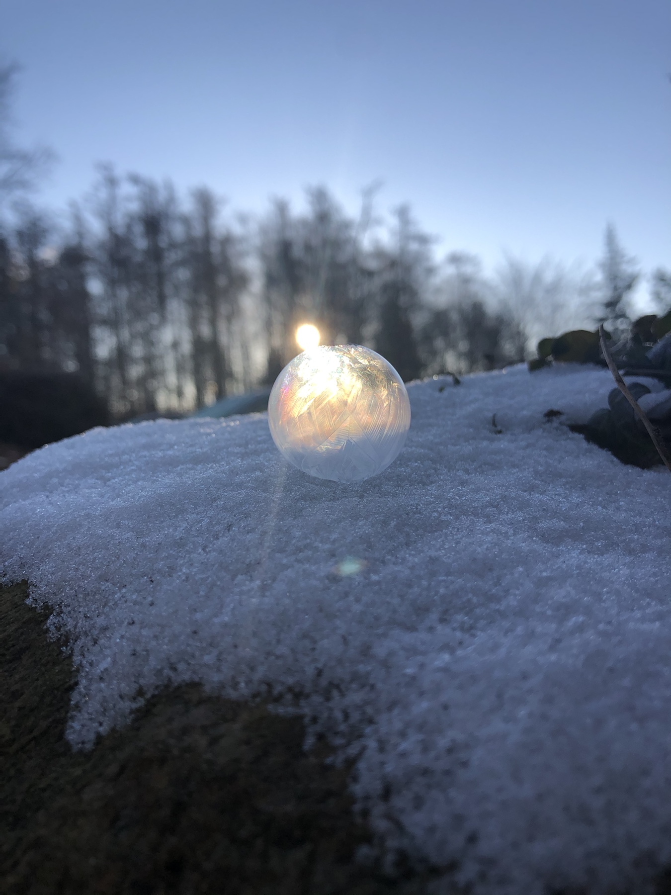 Vi nåede at lave en serie fine isbobler lørdag morgen, mens solen stod op og frosten bed. Det er lidt svært at sæbeboblerne til at lande på sneen og blive liggende længe nok til, at de fryser til is.