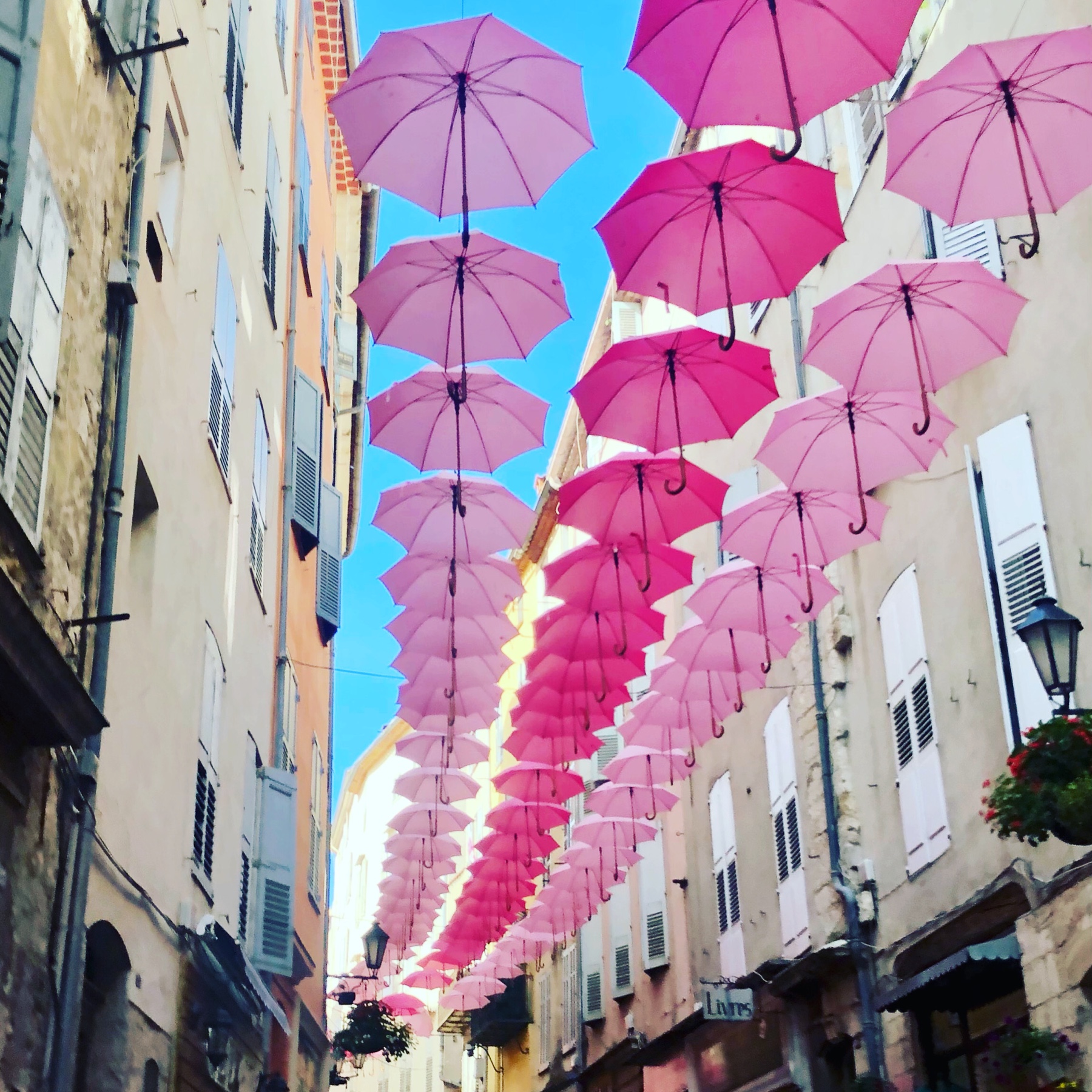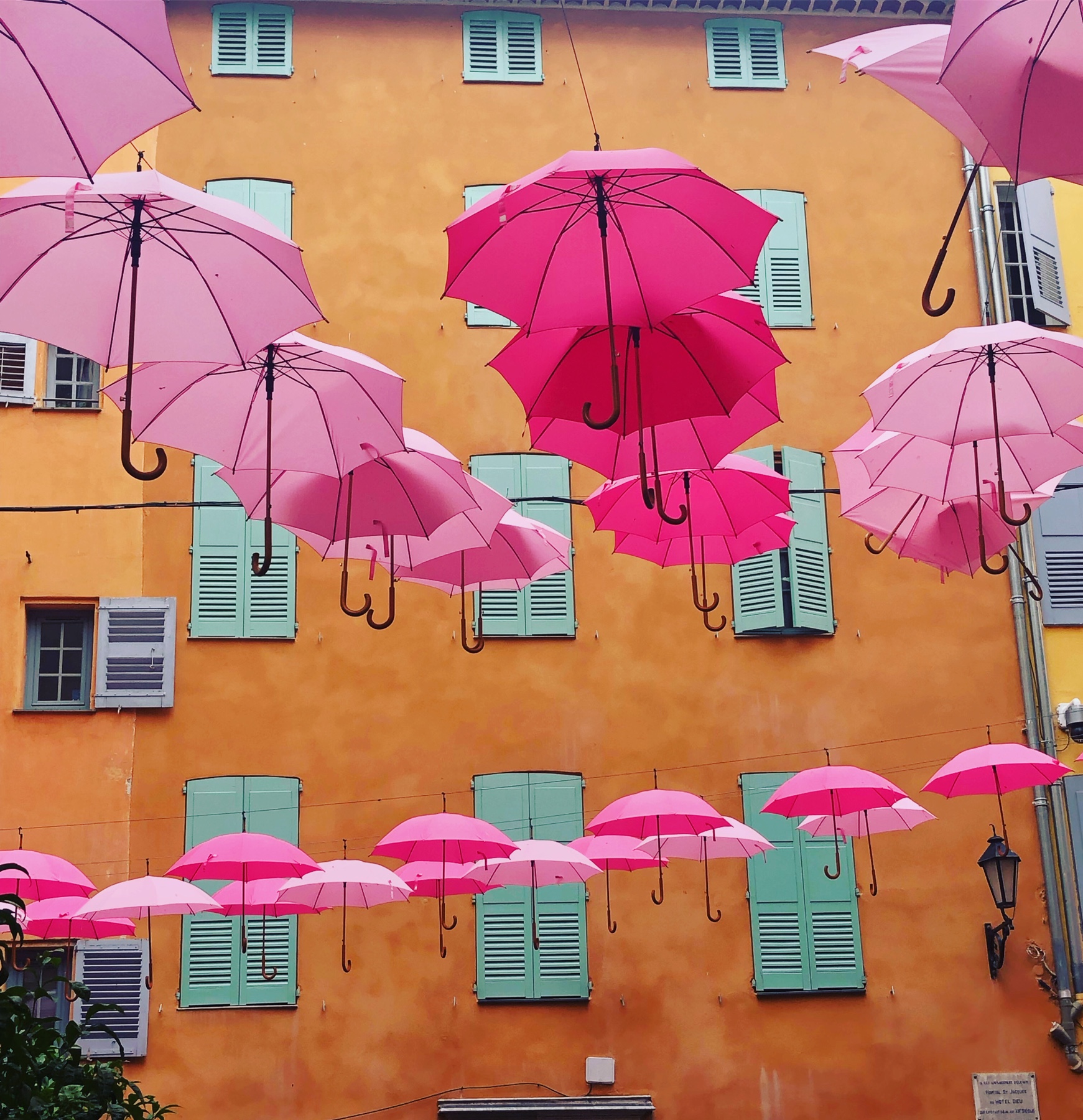 I Grasse hænger der pink paraplyer i to nuancer, præcis som der gjorde i Paris sidste år. Måske har du set paraplyer i gaderne i andre byer? Det er typisk kunstneren Patricia Cunha, der har været på spil. Efter sigende inspireret af Audrey Hepburns citat: