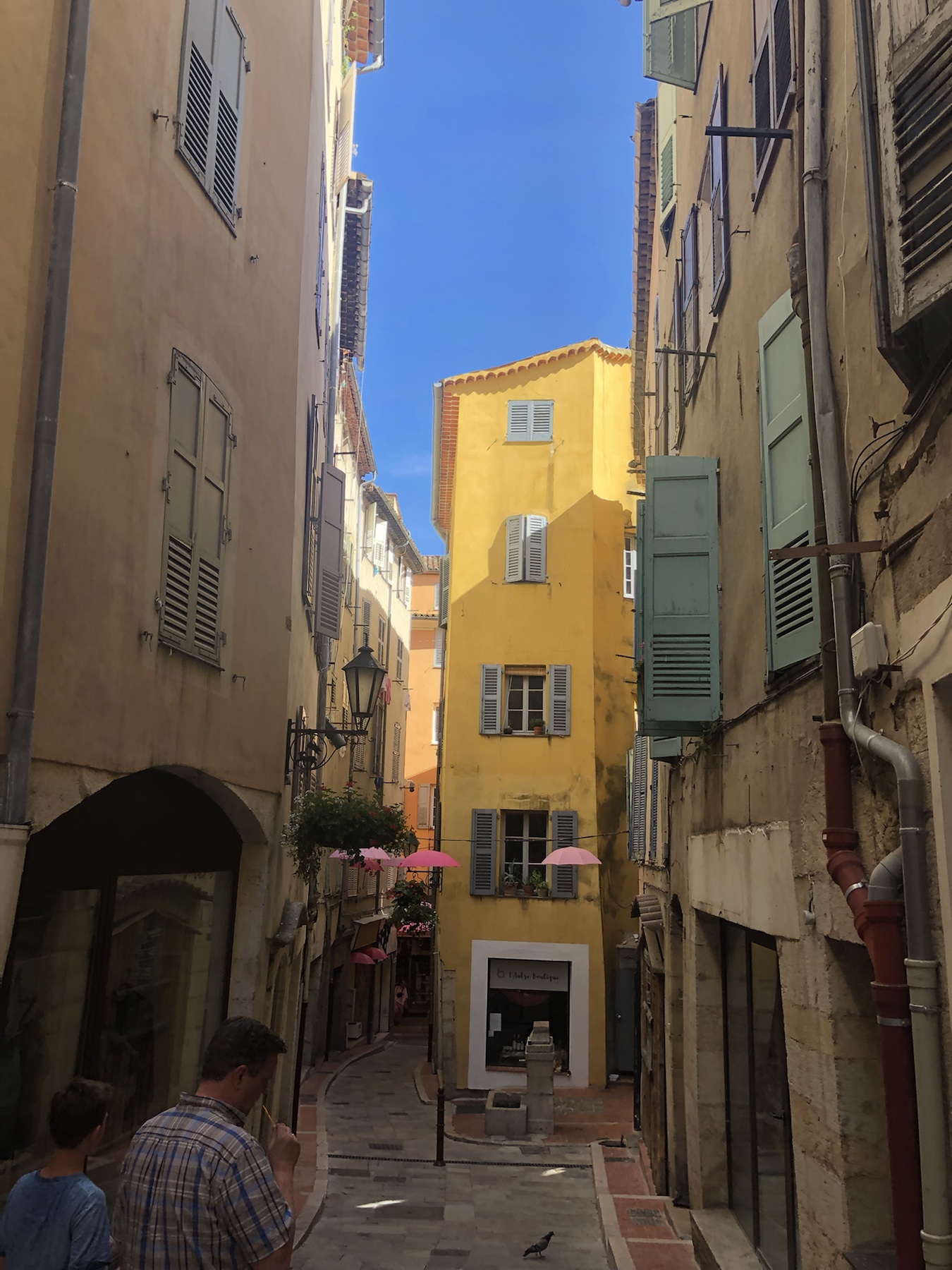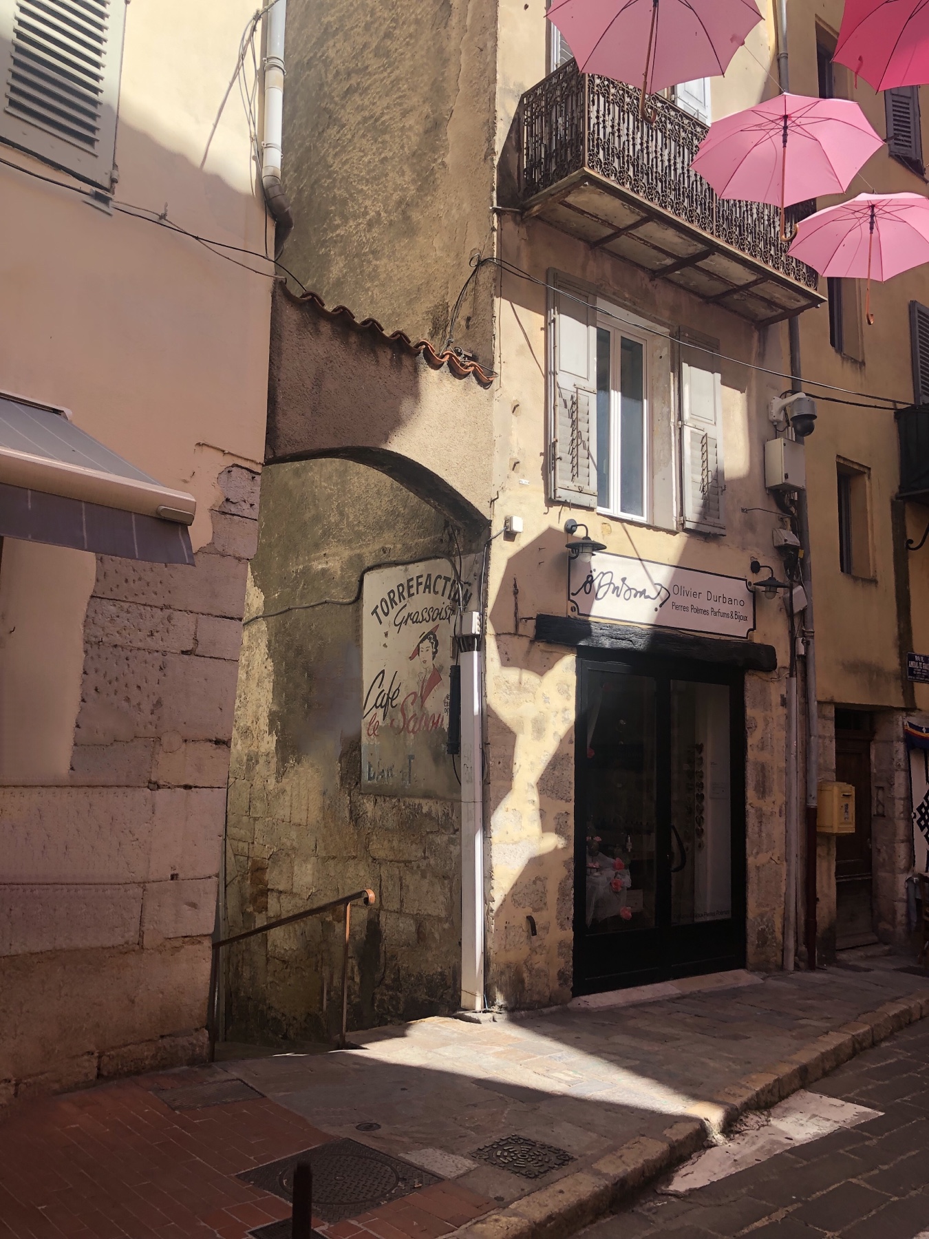 Grasse er mest kendt som parfumebyen. Her findes flere parfumehuse, for ingredienserne vokser tæt ved. Fortsætter man nordpå ud ad byen kommer man til endeløse marker med lavendler og solsikker. Men vi har allerede set både lavendel- og solsikkemarker undervejs, så for os stod den på byvandring i de små kølige gader under de pink paraplyers skygge.