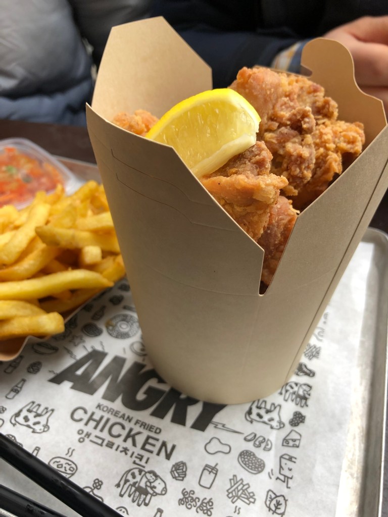 Vi bestilte en box med chicken bites, dressing, fritter og kimchi. Det var voldsomt lækkert. Knasende sprøde chicken bites, lækker saftig kylling i god kvalitet, gode fritter og fantastisk temperamentsfuld kimchi.