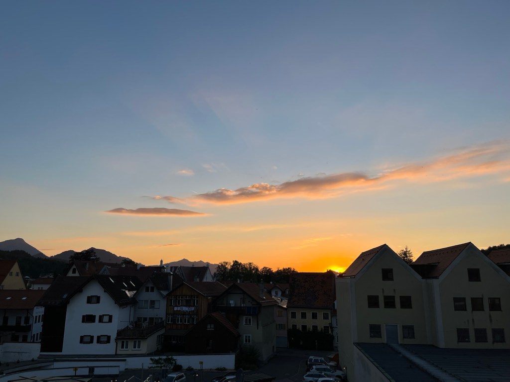 Solen går ned over Füssen – og over dagen, hvor vi forlod Italien for at rejse nordpå og udforske Füssen og fortsætte videre mod Berlin i morgen. Det har været en helvedes dag, og jeg er sygt ked af, at vores ferie i Italien endte med feriemave. Det startede klokken 4:32 i morges, og jeg har ikke sovet siden. Jeg droppede morgenmaden og håbede på, at det hjalp en smule med lidt ristet brød.