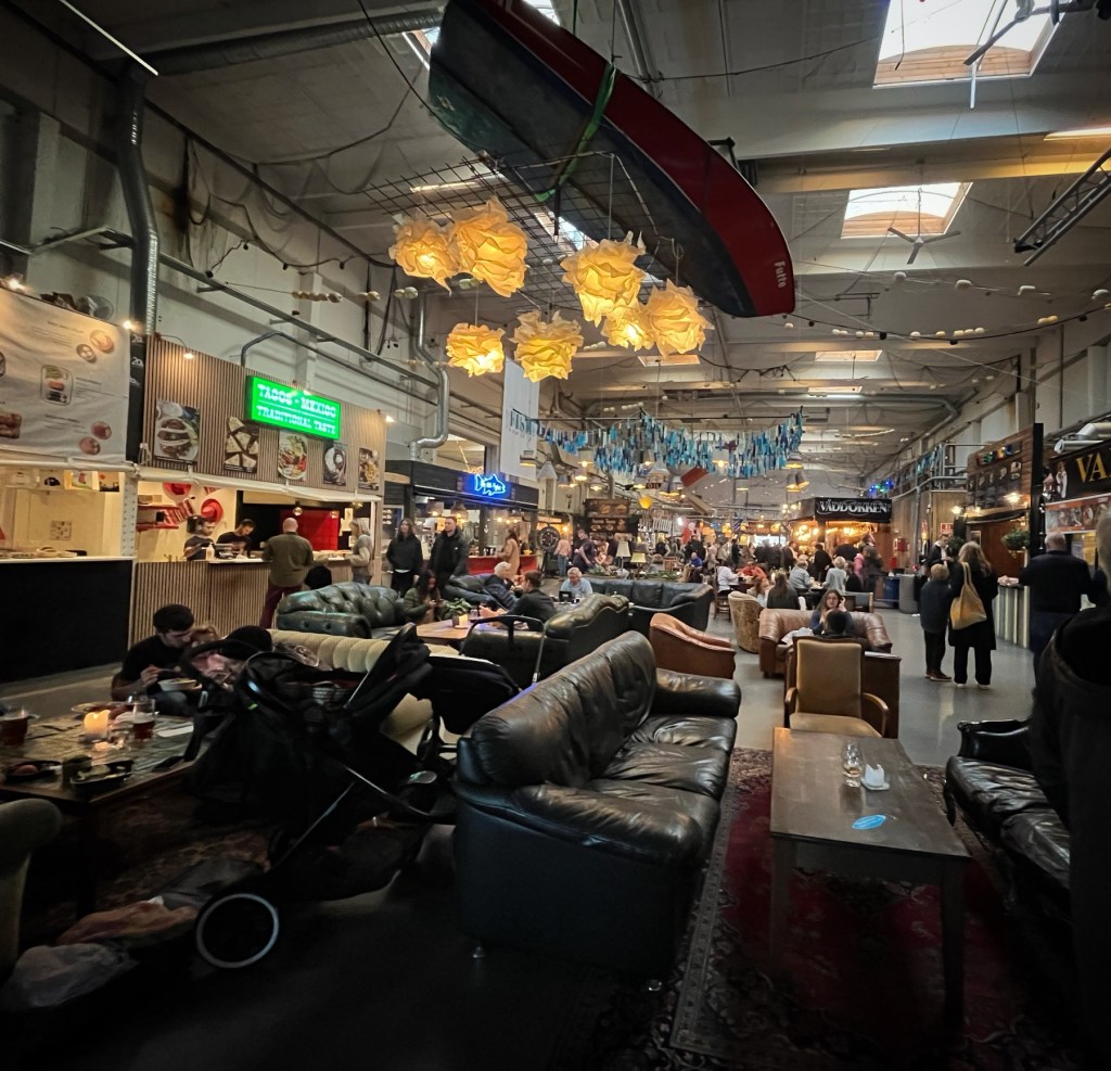 Street food markedet ligger i det gamle skibsværft (som lukkede i 1983) på havnen med kig til Kronborg. Det er kæmpestort og vildt hyggeligt! Der er et kæmpe udvalg i mad og drikkevarer – alle kan få det, de helst vil have.