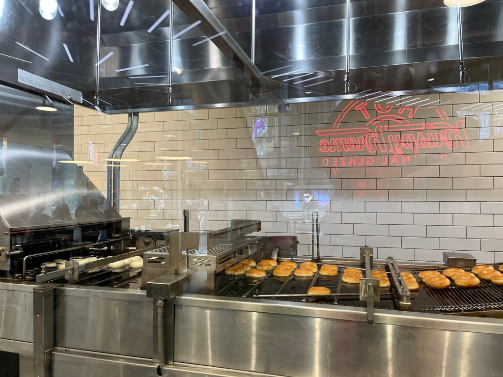 Butikken på Times Square er både produktion, dekoration, salg og cafe. Der var fyldt med mennesker, som så på de mange donuts, der var ved at blive tilberedt.