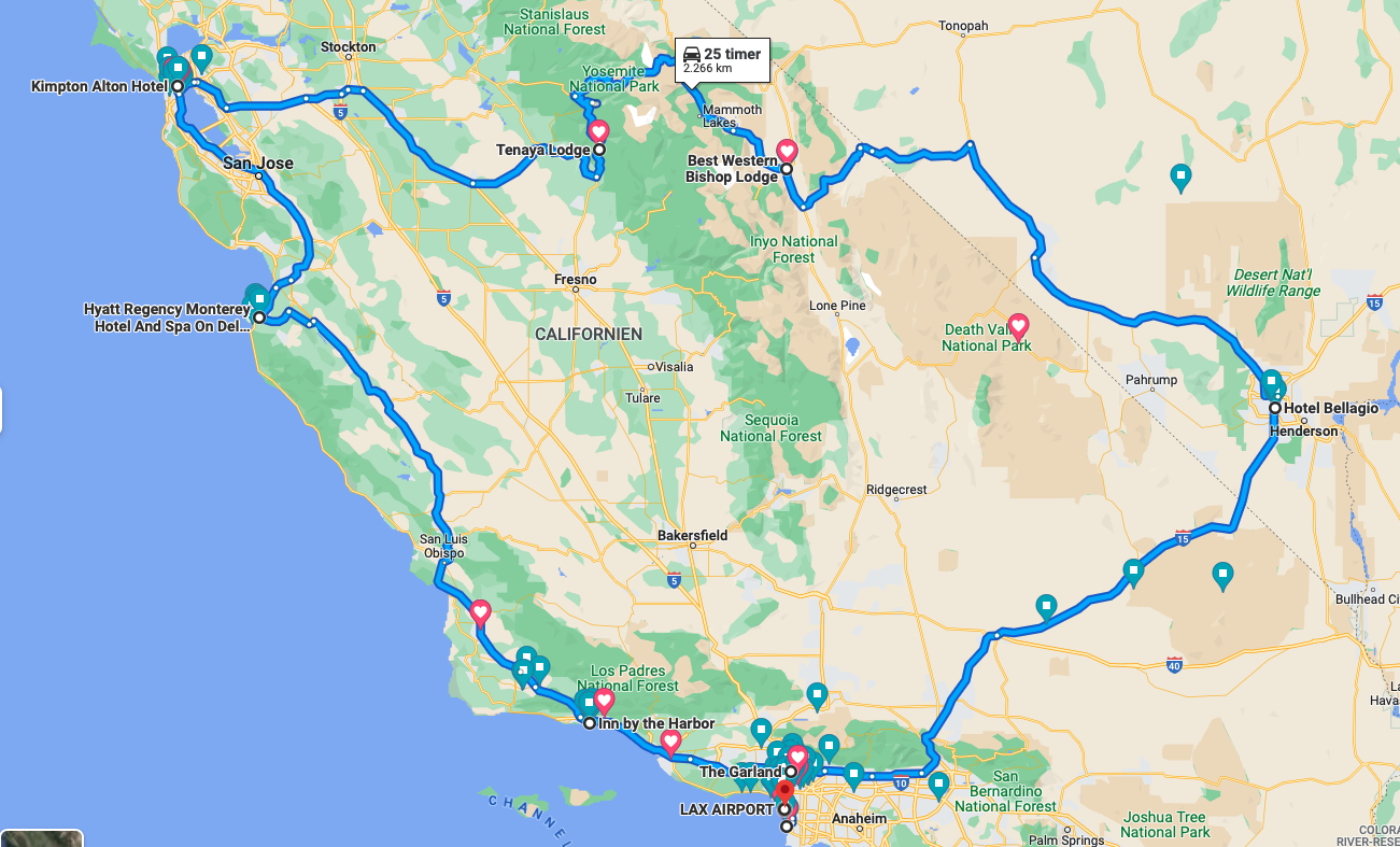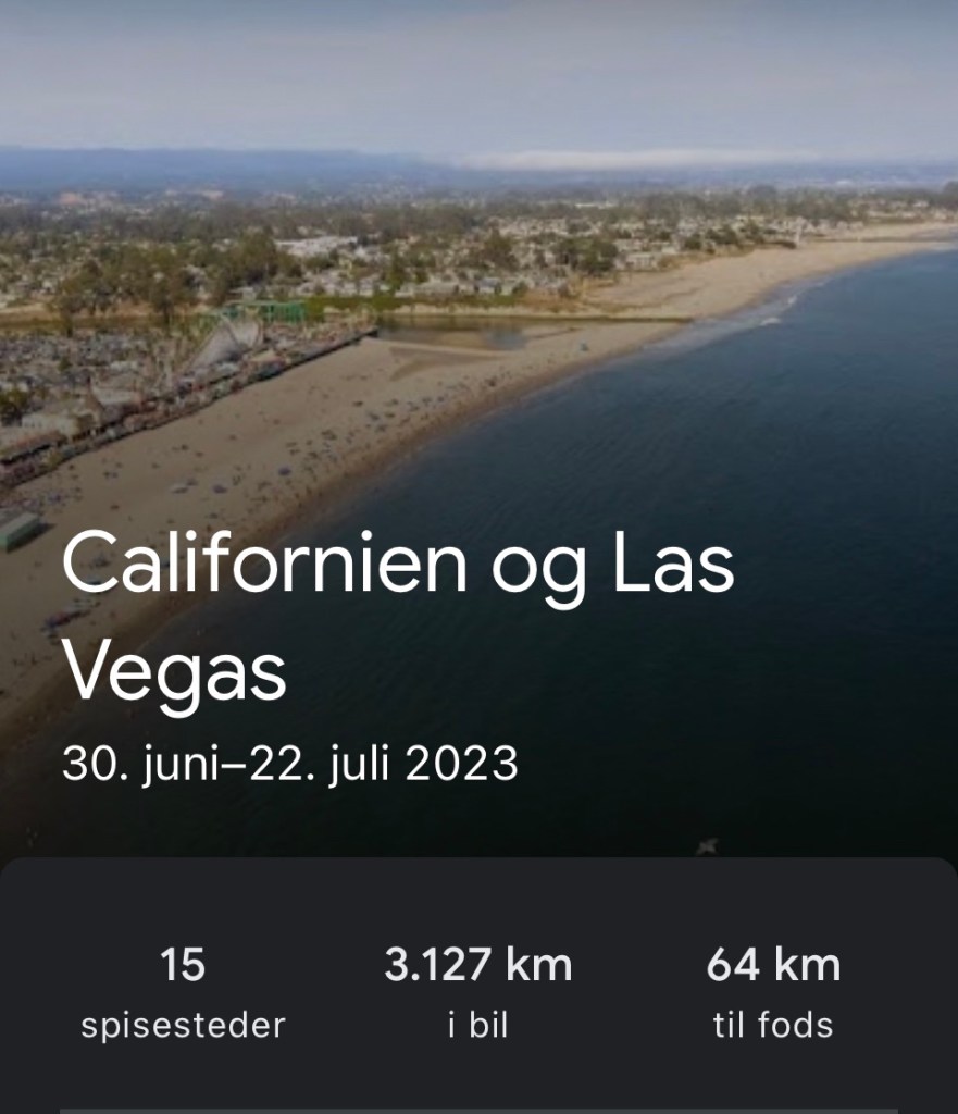 Vi er så småt landet i hverdagen efter 23 vilde dages rundrejse i Californien/Nevada: Los Angeles, Las Vegas, Yosemite, San Fransisco, Monterey, Santa Barbara, Redondo Beach. 2.400 tilbagelagte kilometer tilbagelagt i bil. Og dertil fly, helikopter, bus, færge. 64 kilometer har vi gået. 8 hoteller har vi boet på. 15 spisesteder. Vi har besøgt 2 stater. Og har fået en million indtryk og oplevelser, som dukker frem i hukommelsen drypvis.