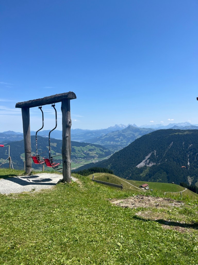 Nu hvor han nærmer sig 15 år, er det spændende men også lidt skræmmende, at der er så langt ned, at toget på togbanen langt nede i Brixental bare ligner en larve, der piler afsted.
